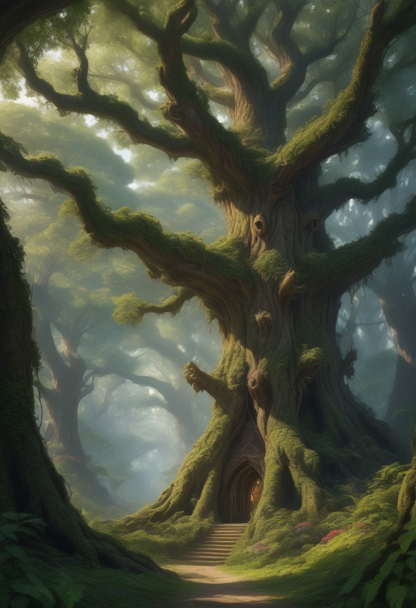 fantasy forest, an expansive ancient forest, featuring a towering oak, majestic leaf canopy, diverse wildlife, a variety of flora, and a feeling of grandeur,
