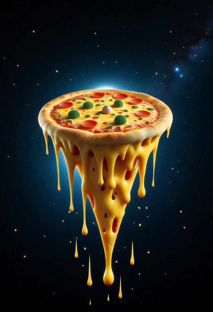 (masterpiece, best quality, very aesthetic, absurdres, highers, high definition, amazing quality, ultra detailed:1.2), photo realistic, earth planet, stars, constellation, light particles, surreal, dripping cheese, pizzasdx, black background, sun