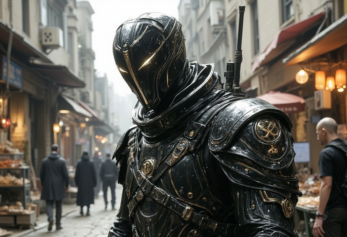 fg A heavily armed cyberpunk male in the style of Jakub Rozalski. He is an assassin. The male should have futuristic cybernetic augmentations, wearing muscular, broad-shouldered, high-tech attire. The setting is a cyberpunk street market. The scene should have a tense, suspenseful aura with a mix of modern technology and traditional elements, reflecting a unique blend of futuristic and historical styles.