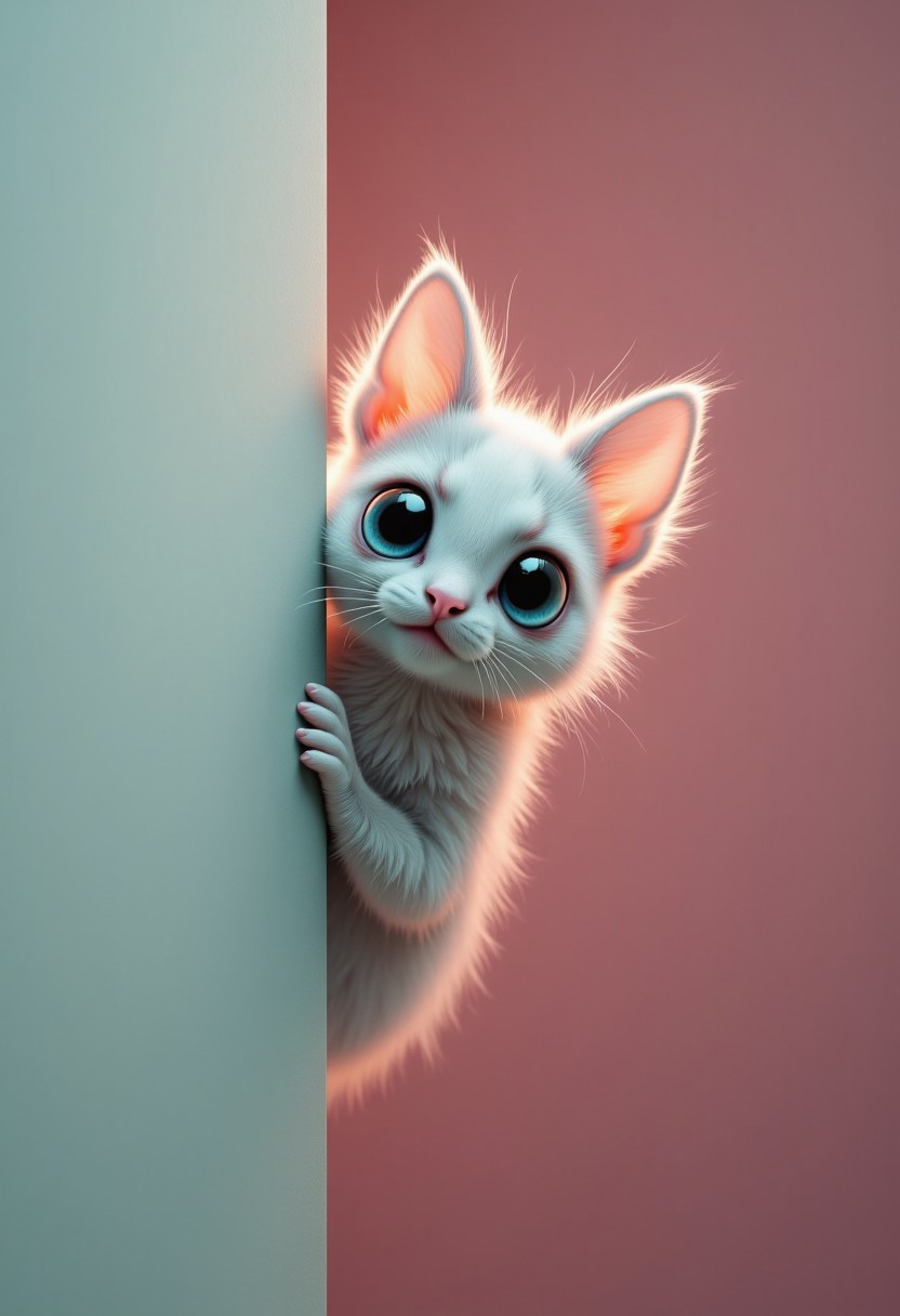 A whimsical ethereal creature peeks into the corner of a vertical wall, its large, curious eyes staring directly into the frame as if observing the viewer. The cute shy creature seems begging for affection, Vibrant Glow,