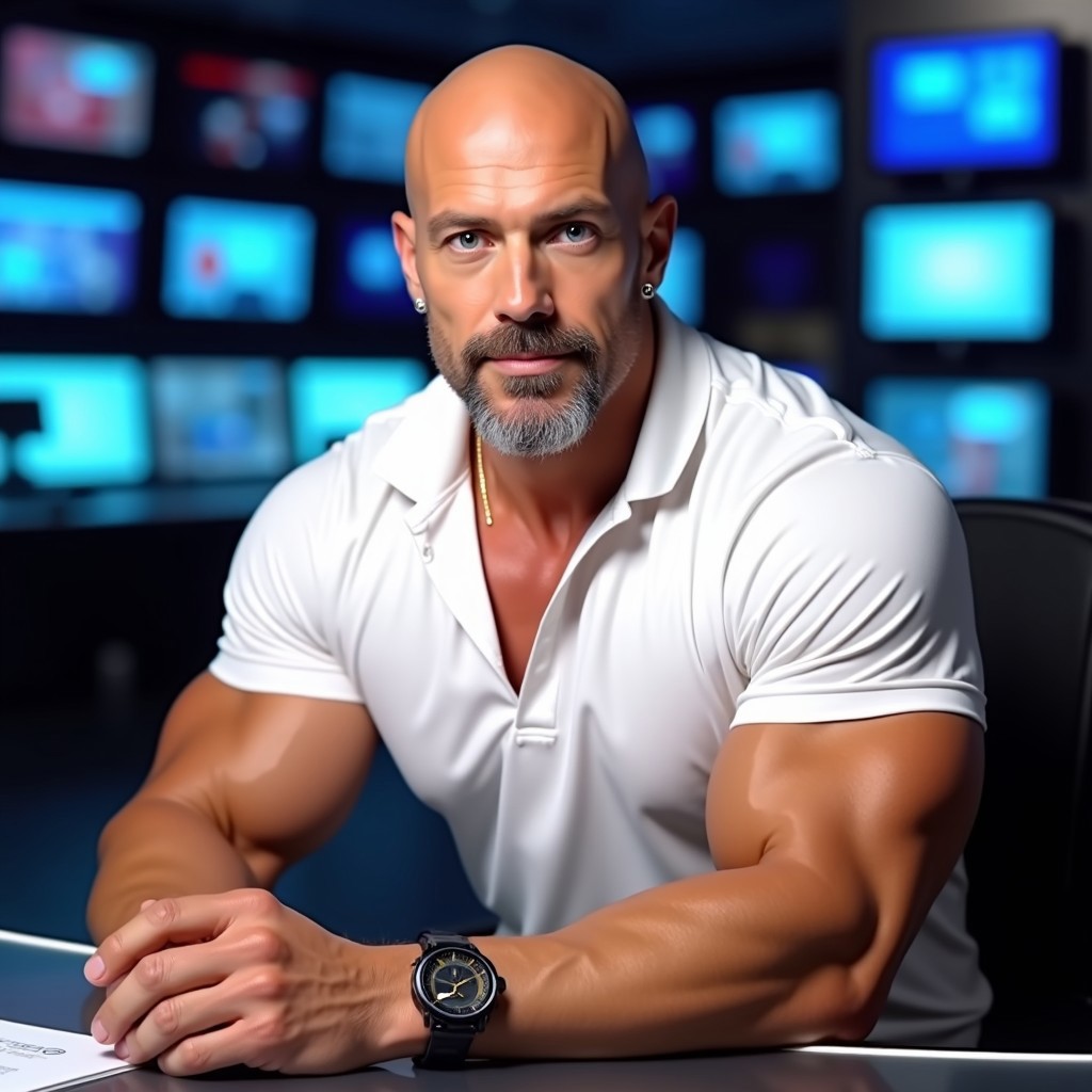 a full lenght photo of a beautiful tall very muscular 50yo Scandanavian news anchorman bald and hs a grey goatee is wearing a white tight-fitting cap sleeved polo shirt with a plunging neckline that is unbuttoned to show his massive pecs and he wears tight fitting black slacks. He sits at the news anchor deask with many computer monitors showing the news behind him. He has bright blue eyes and earrings and his skin is tan and glossy. He is clean shaven and has no body hair. There is a news ticker scrolling across the bottom of the screen. His arms rest on the news anchor desk.