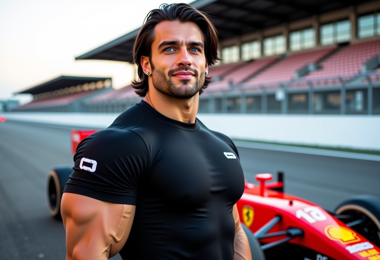 a full lenght photo of a beautiful very muscular 18yo Scandanavian race car driver man with medium length black hair is wearing a tight-fitting cap sleeved T-shirt with a plunging neckline that shows his massive pecs and he is standing next to a formula 1 race car on a race track. He has bright blue eyes and earrings and his skin is tan and glossy. He is clean shaven and has no body hair.