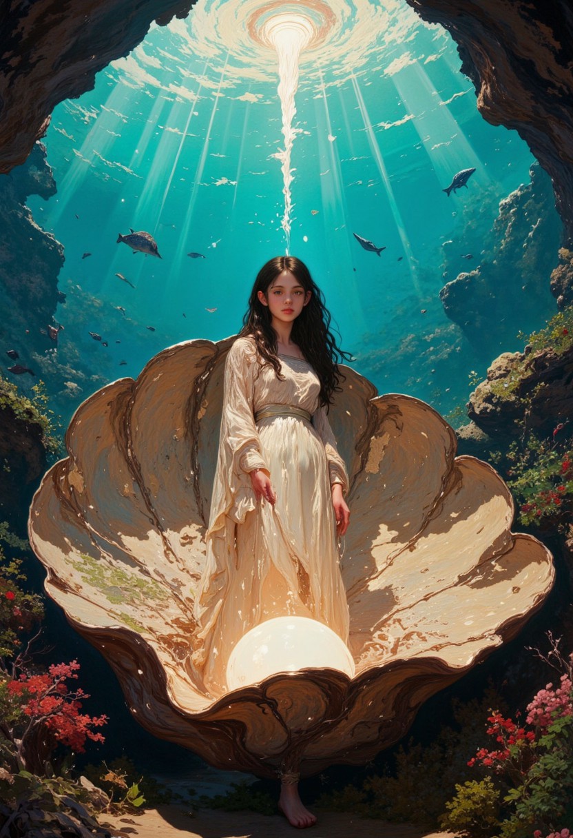 8k high quality digital painting , masterpiece, very detailed, ultra realistic, (best quality) very detailed epic masterpiece, boris vallejo style, a beautiful girl is standing in a huge opened seashell and holds a glowing huge pearl in her hands, sensual facial expression, beautiful face, unearthly beautiful, the mussel shell glitters in all colors, underwater scene, colorful corals, fish in the background, rays of light fall into the water from above, boris vallejo style, low saturation, photo realistic oil painting,
