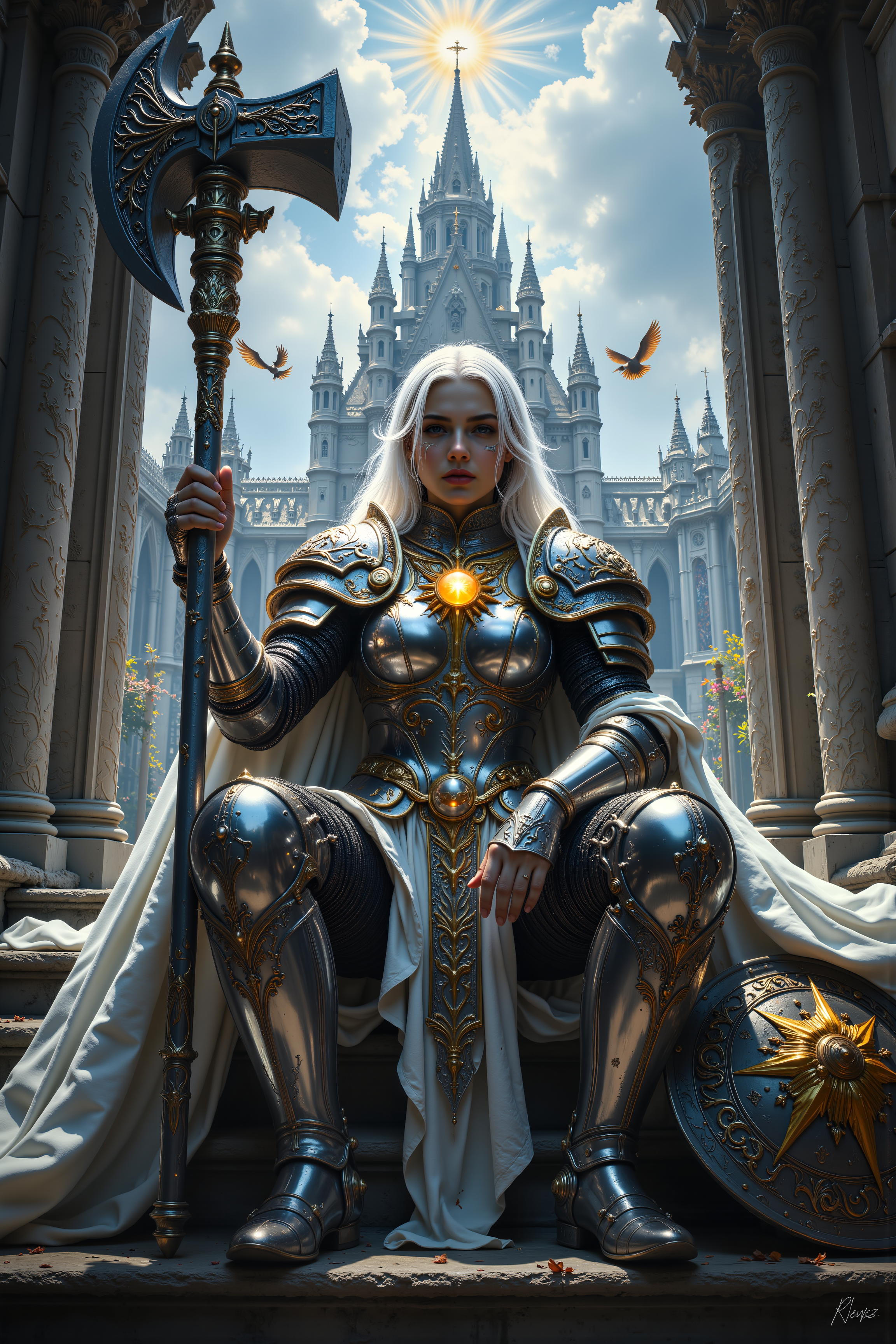 R3alisticF,An aasimar crusader tends to her warhammer while seated on a temple step. Her armor is brilliantly polished silver plate with gold accents, each piece inscribed with celestial script that glows faintly in darkness. A white cloak bearing her order's symbol hangs from her shoulders, and a shield emblazoned with a rising sun rests nearby. The temple behind her rises impossibly high, its spires reaching into the clouds where flying buttresses seem to touch the heavens. Her white hair seems to glow with an inner light, eyes of pure gold lacking pupils, while her face bears symmetrical markings that shine when she channels divine power. Fantastic lighting. Detailed shadows.intricate details, vivid colors, hyper-detailed, ultra-sharp<lora:FluxMythR3alisticF:0.4><lora:midjourney_whisper_flux_lora_v01:0.4><lora:aidmaMJ6.1-FLUX-V0.1:0.4><lora:Movie_Portrait:0.4><lora:Flux DetailerV2:0.4>