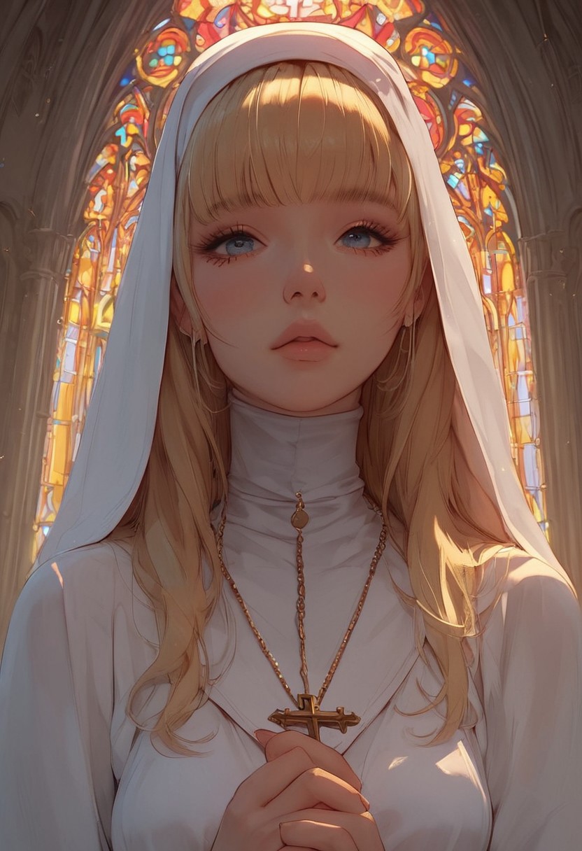 score_9, score_8_up, score_7_up, score_6_up, ((1 woman, 27 year)), ((Long straight blonde hair, Bangs)), Detailed innocent face, Big round eyes, Nun, Shows her soft breasts, Cute nose, round face, On top of you, Expression of sexual desire, Church