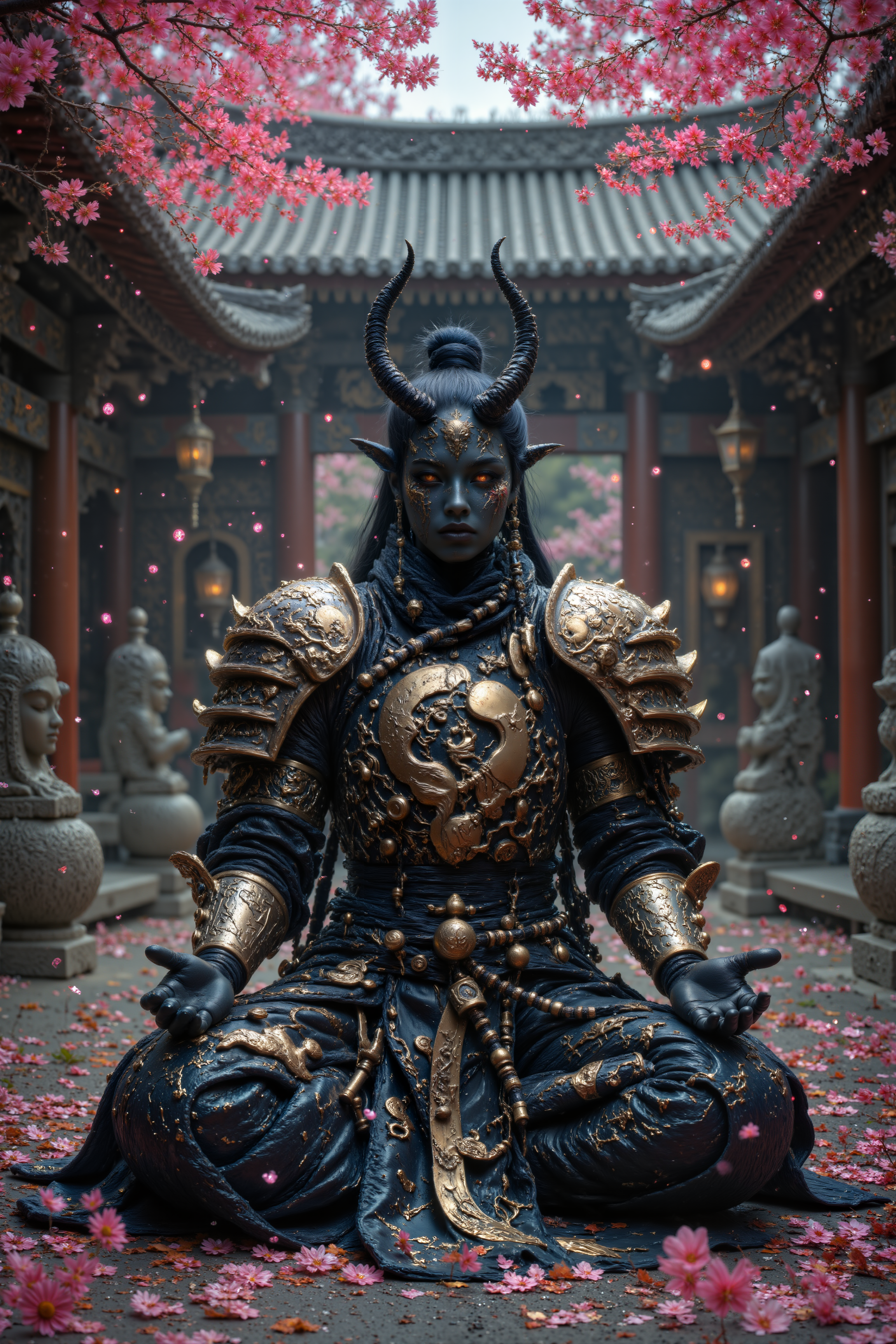 R3alisticF,A tiefling sword-saint meditates in a temple courtyard, her curved greatsword balanced perfectly across her palms. Her armor combines traditional eastern design with infernal influences, black lacquered plates decorated with gold filigree depicting scenes of epic battles. Prayer beads and paper talismans hang from her obi, alongside a wakizashi and set of ritual knives. Cherry blossoms fall around her in the courtyard, where ancient stone guardians stand eternal watch. Her obsidian horns curve elegantly upward, decorated with gold rings, while her jet-black hair is tied in a traditional topknot, and her solid gold eyes occasionally flicker with inner flame. Fantastic lighting. Detailed shadows.intricate details, vivid colors, hyper-detailed, ultra-sharp<lora:FluxMythR3alisticF><lora:midjourney_whisper_flux_lora_v01>