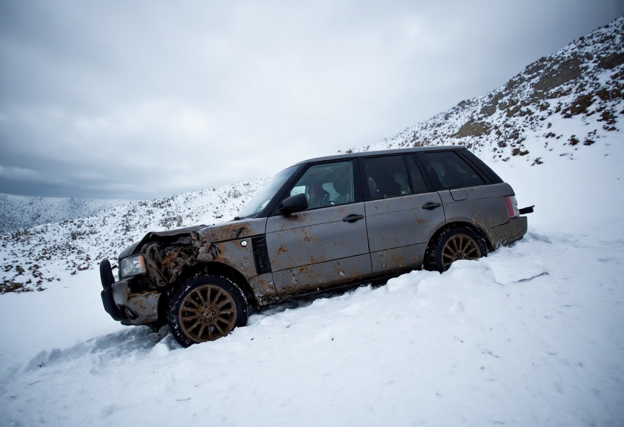 A heavily battered Range Rover L322, bearing the deep scars of a catastrophic crash, claws its way up the treacherous slopes near Everest’s base at nearly 8000 meters above sea level. Torn metal panels rattle in the howling wind, and shattered windows offer little protection against the swirling, ice-laden snow. The storm rages relentlessly, obliterating visibility as jagged peaks loom like silent sentinels in the white abyss. Each surge forward tests the vehicle’s fractured chassis and the driver’s nerve, with freezing temperatures gnawing at every bolt and breath. Despite the savage conditions, the headlights carve narrow corridors through the blizzard, revealing precarious cliffs and ever-shifting drifts that threaten to swallow the path whole. The battered SUV’s engine roars defiantly, wrestling with slick ice and steep inclines as if each tire rotation is an act of sheer will. Above, thunderous gusts of wind tear at the broken frame, but neither machine nor driver yield. Every second is a brutal contest against the mountain’s wrath, and every heartbeat is a testament to unbreakable resolve, pushing ever upward in search of triumph at the roof of the world. (aidmaimageupgrader, flux dev, extreme weather, dangerous conditions, deep snow, snow storm, blizzard, carcrash)