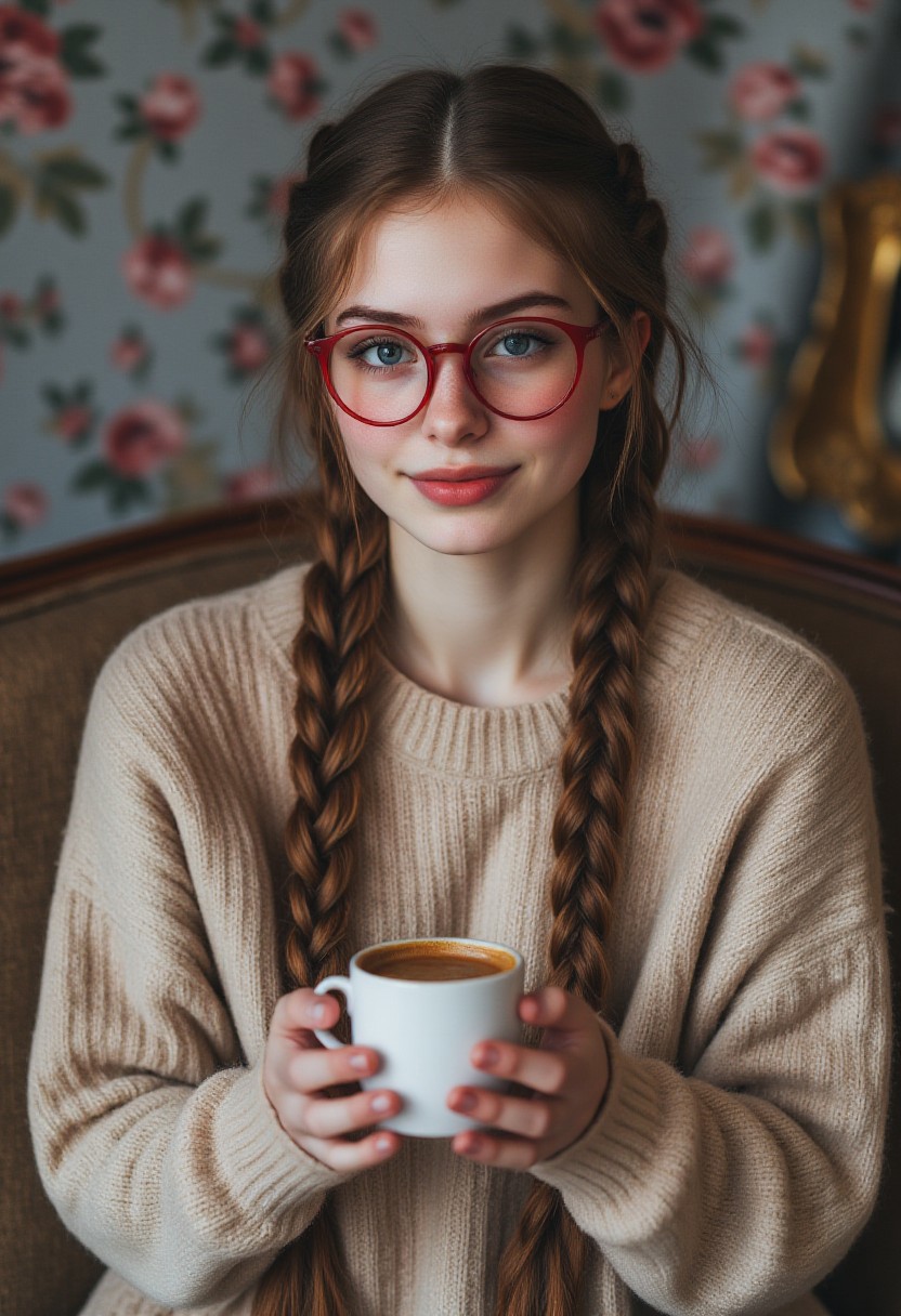 FictionalBeth a nerdy white girl in her late 20s, brown hair, twin braids, Thick red rimmed glasses, grey eyes. Wearing a cozy wool sweater and holding a cup of hot chocolate on a comfy couch