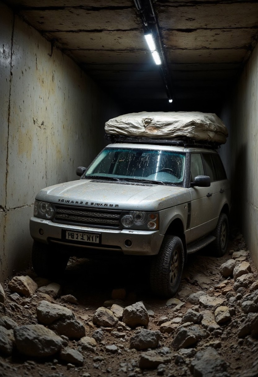 Deformed off-road Range Rover L322, pitch black background, flooded parking lot, extremely high water level, concrete ruins. A good quality [security camera::2] flash picture taken on a cheap [iphone:android:1]. It's a poor night (side:1.4) photo of an abandoned off-road Range Rover L322 with off-road modifications, standing crushed under a collapsed and flooded underground parking. The car is heavily damaged, deformed after a ceiling collapse, lowered under the pressure of concrete wrecks on top of the car body. Large collapsed concrete wrecks on the scratched and damaged vehicle. Broken windows. Dark and heavily flooded parking lot, with water raised up at the knee level. (Environment is pitch black:1.1). Camera front flash is the only tiny source of light. Collapsed from heavy earthquake concrete walls and columns in the dark background. Compressed jpeg artifacts. detailifier, aidmafluxpro1.1 cpollabandbuilding
