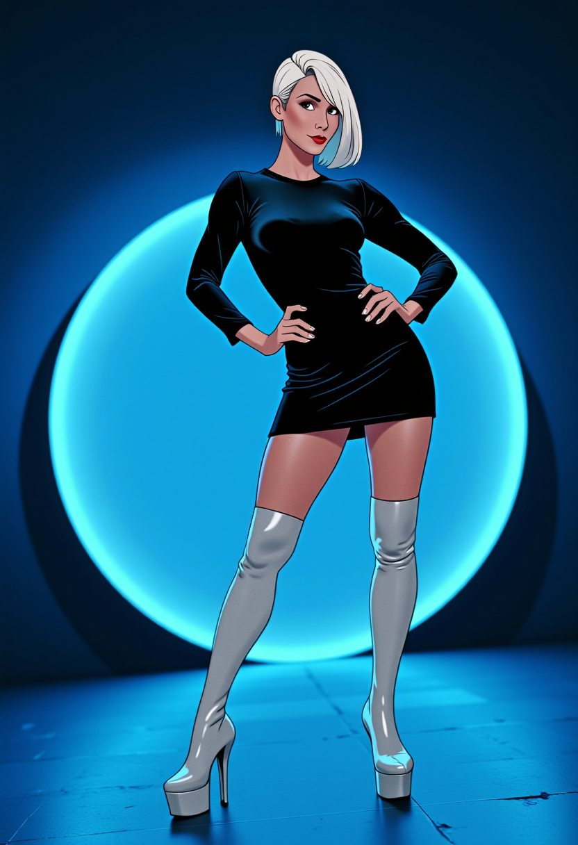 Disney anime, Disney Morph, Disney Style, (2D Animation), 1girl, Go-go dancer, 1960s style, (darl velvet dress to the middle of the knee. long sleeves,) , beautiful legs, high white platform boots. platinum cropped hair. (wide hips). dynamic pose ,full dressed , masterpiece, best quality, ,, swept-back hairstyle, graceful neck and shoulders, perfect body, (subsurface scattering:1.1), wide hips, Alabaster Skin, (glossy oiled skin:1.1), sharp focus, stark lighting, dramatic lighting, striking composition, confident and empowered woman, strong and assertive pose, fashion, sensuality, high end clothing, luxury accessories,dynamic pose, bdsm props,, . The background is minimalist, a gradient of shadowy blue tones, amplifying the ethereal and futuristic ambiance of the scene. The overall composition feels cinematic, blending high fashion with a science fiction aesthetic. . Exquisite cyberpunk. retroFuturism. . (Depth of field), low saturation,detail. ,,. masterpiece, best quality, medium-format camera, high-contrast, dramatic lighting, striking composition, CPA. Alexis