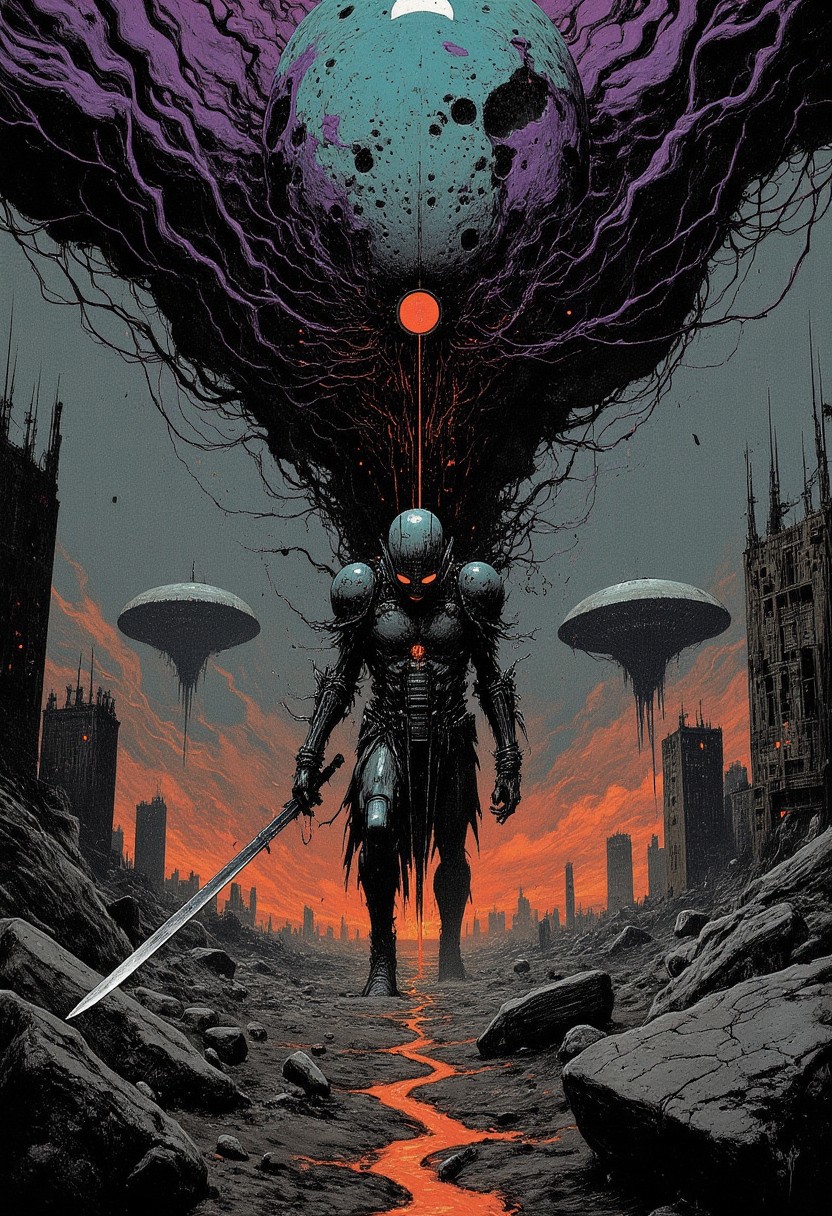 A shattered dystopian metropolis sprawls beneath a storm-torn sky, where turbulent clouds churn with streaks of violet and fiery orange, illuminated by jagged lightning that cuts through the gloom. The air is alive with the chaos of a soulstorm—an ethereal tempest of swirling, spectral energy that spirals through the ruins, its glowing trails pulsing with hues of cyan, crimson, and ghostly silver. Sharp, directional lighting breaks through the chaos, casting dramatic shadows that ripple across the cracked surfaces of the decayed cityscape. In the foreground, a close-up reveals a lone figure standing amidst the storm. His armor, a blend of matte black plating and glowing red circuitry, glistens with droplets of rain and spectral light as arcs of energy reflect off its surface. The figure grips a humming plasma blade, its shifting magenta glow illuminating their tense posture and the twisted tendrils of fog that coil around his feet.His visor flashes with a faint amber glow, concealing their expression as the storm’s howling winds whip past them. Behind, colossal drones hover silently, their searchlights cutting through the haze, while towering ruins flicker with remnants of holographic propaganda. The soulstorm intensifies, lightning illuminating the ghostly forms of spectral beings caught within its grasp, their haunting wails echoing across the desolate landscape. The figure’s silhouette stands defiant, a stark contrast against the chaos and destruction swirling around them.