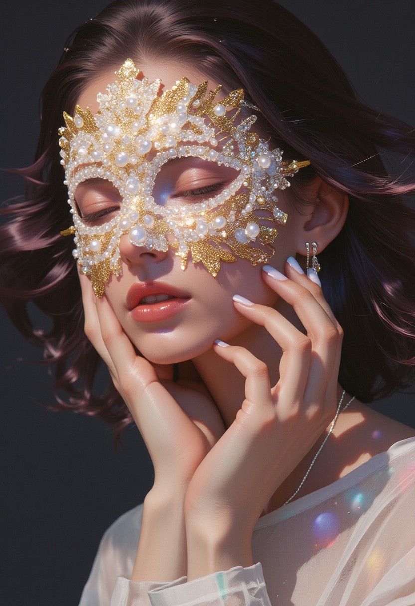 A highly detailed, artistic photograph featuring a woman with fair skin and dark brown hair styled in loose, flowing waves. Her serene expression, with eyes closed and lips slightly parted, conveys a contemplative, almost ethereal aura. Her hands are positioned gracefully—her left hand gently touching her cheek and her right resting lightly on her chest—emphasizing a sense of delicate poise. She wears an ornate, full-face mask crafted entirely from white and cream-colored pearls, intricately adorned with gold floral designs that weave seamlessly into the pearlescent texture. The mask covers her features completely, transforming her visage into a surreal and otherworldly work of art. The background is a deep, dark gradient, providing a dramatic contrast to the light, intricate details of the mask and the soft, glowing quality of her skin. The diffused lighting highlights every element with precision, casting a gentle radiance over the pearls, gold accents, and her smooth complexion. The overall composition is elegant and refined, combining high-fashion elements with fine art aesthetics to create an image that is both visually striking and emotionally evocative. This polished masterpiece captures a harmonious interplay of texture, light, and form, offering an immersive and unforgettable visual experience. (iridescent, aesthetic, in the style of Jed-clrfl)