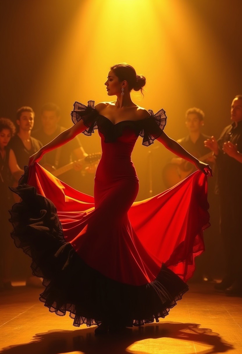 In the center of a warm and atmospheric stage, illuminated with golden tones and deep shadows, a beautiful woman dances flamenco with passion and strength. Her figure is elegant and stylized, standing out in a traditional dress that hugs her body, in a vibrant crimson red with black ruffles that seem to flow with her every movement. Her arms are extended gracefully, and her expression reflects intensity and emotion, capturing the spirit of flamenco. The background fades into soft Konstantin Razumov-style brush strokes, while the rich, detailed textures of the dress and the lighting on her skin make her the absolute focus. At her side, a barely suggested touch of guitarists and clapping, blurring the scene to focus attention on the dancer, who embodies the strength, beauty and pure art of flamenco.