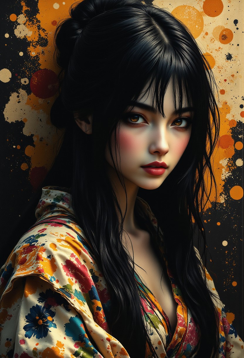 R3alisticF, midjourney_whisper_avant_couture, Inkplash art on rice paper, sepia, henna , inksketch, Silhouette Art, magnificent, dark background, inksplash portrait of stunning japanese woman, long dark hair with platinum streaks, sidelocks, bangs, seductive, sultry, lustful, red lips, direct gaze, light hitting one side of face, inksplash abstract background