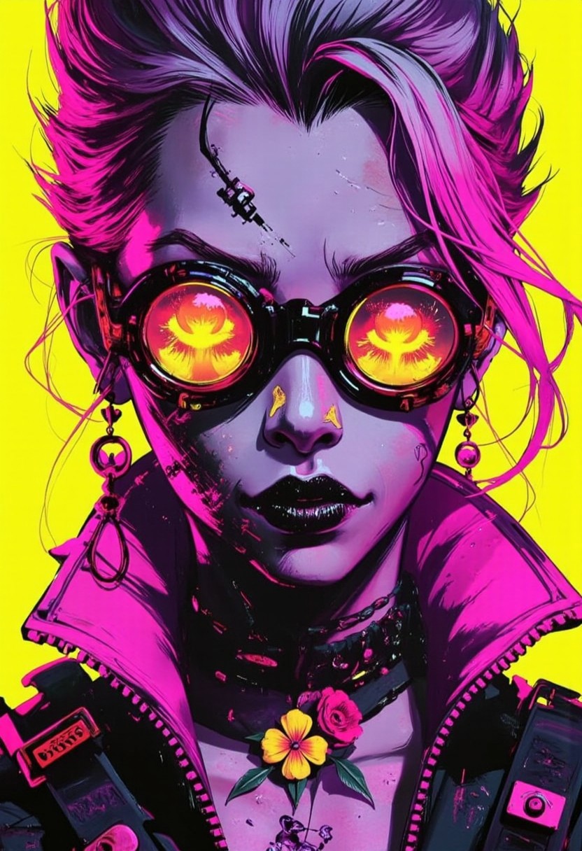 bo-neon, ArcaneFGTNR, a digital illustration in a vibrant, gothic style, it features a close-up of a young woman's face, with striking, exaggerated features, her skin is a pale, her eyes are large and vivid, with a striking amber hue, and her lips are full and slightly parted, revealing a playful, mischievous naughty smile, she has windblown hair with pink highlights, with loose strands framing her face, her makeup is sexy bold and dramatic, with thick, black eyeliner and mascara accentuating her large, expressive eyes, she wears large earrings and a striking necklace of flowers, and a pink, high-collared top with a lot of fur and lace, the background is a solid, bright yellow, which contrasts sharply with her vivid colors, making her stand out vividly, the overall composition is dynamic, with the woman's expression and makeup drawing the viewer's attention, high quality, ultra detailed, colorful, grainy, cyberpunk fantasy<lora:ArcaneFGTNR.safetensors:1.0:1.0> <lora:Flux\boFLUX Neon Abyss.safetensors:1.0:1.0>