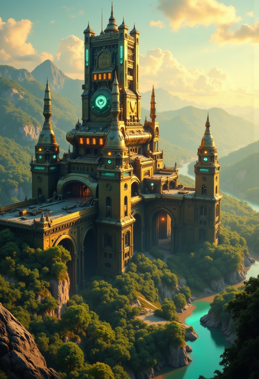 CAICO, Inkpunk Anime, detailed photorealistic image, vibrant earthtone colors, a_skynet_cyberdyne_craft, the image is featuring a sunlit scene of a stone armoured fortress on a jungle landscape of rivers and forest, with gleaming golden towers, black and gold alloy surfaces with high-end circuitry, blueband green glowing diodes and lights, giving a highly advanced, industrial military look, with large plasma cannons and rocket launchers; large depth of field