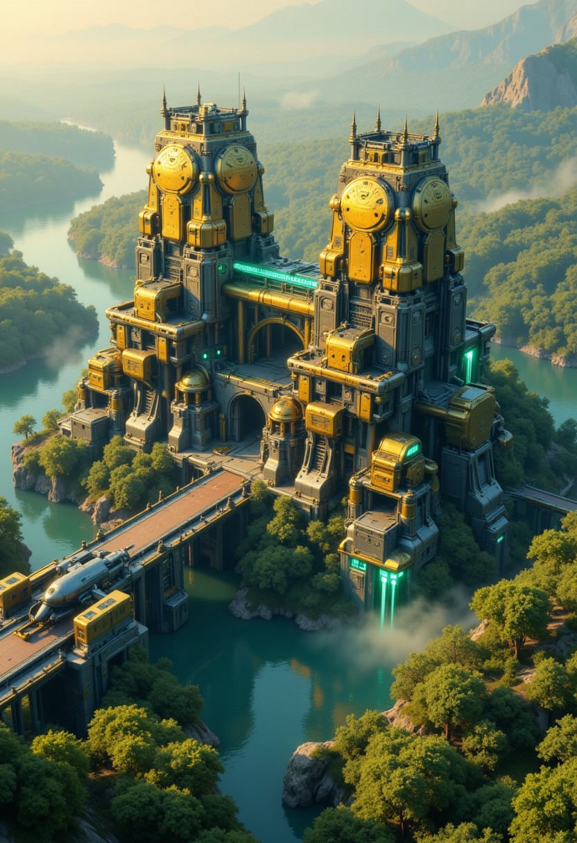 CAICO, Inkpunk Anime, detailed photorealistic image, vibrant earthtone colors, a_skynet_cyberdyne_craft, the image is featuring a sunlit scene of a stone armoured fortress on a jungle landscape of rivers and forest, with gleaming golden towers, black and gold alloy surfaces with high-end circuitry, blueband green glowing diodes and lights, giving a highly advanced, industrial military look, with large plasma cannons and rocket launchers; large depth of field