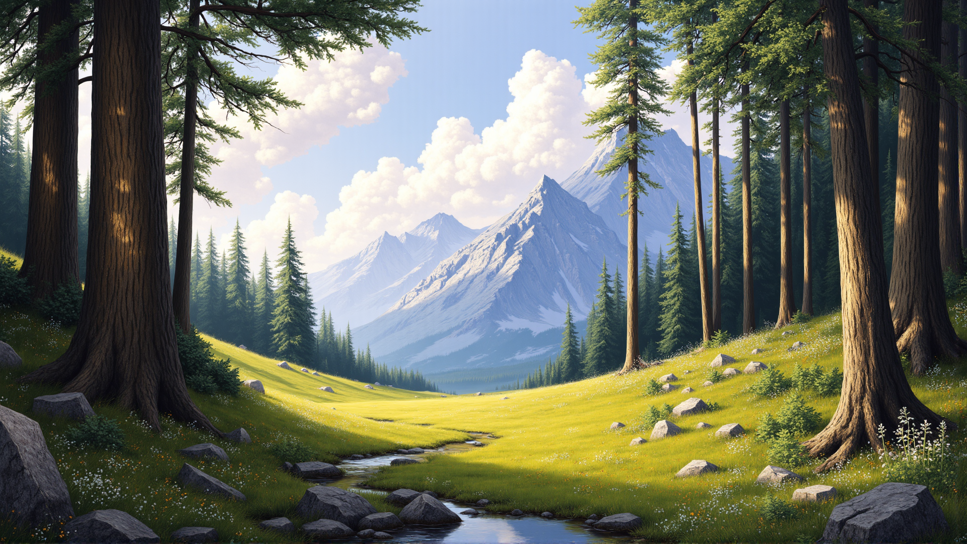 Oil painted a view from the top of the mountain a serene landscape with a clearing in the middle of a mountain range. The clearing is expansive, with lush, green grass and wildflowers scattered across the ground, providing a peaceful contrast to the towering, rugged mountains in the background. On the left side of the clearing, the terrain is open, with gentle slopes leading up to the mountains, while the right side is bordered by a dense forest of tall, ancient trees, their trunks thick and covered in moss. The light filters through the canopy, casting dappled shadows on the forest floor. A few scattered rocks and small streams run through the clearing, adding natural beauty to the scene.