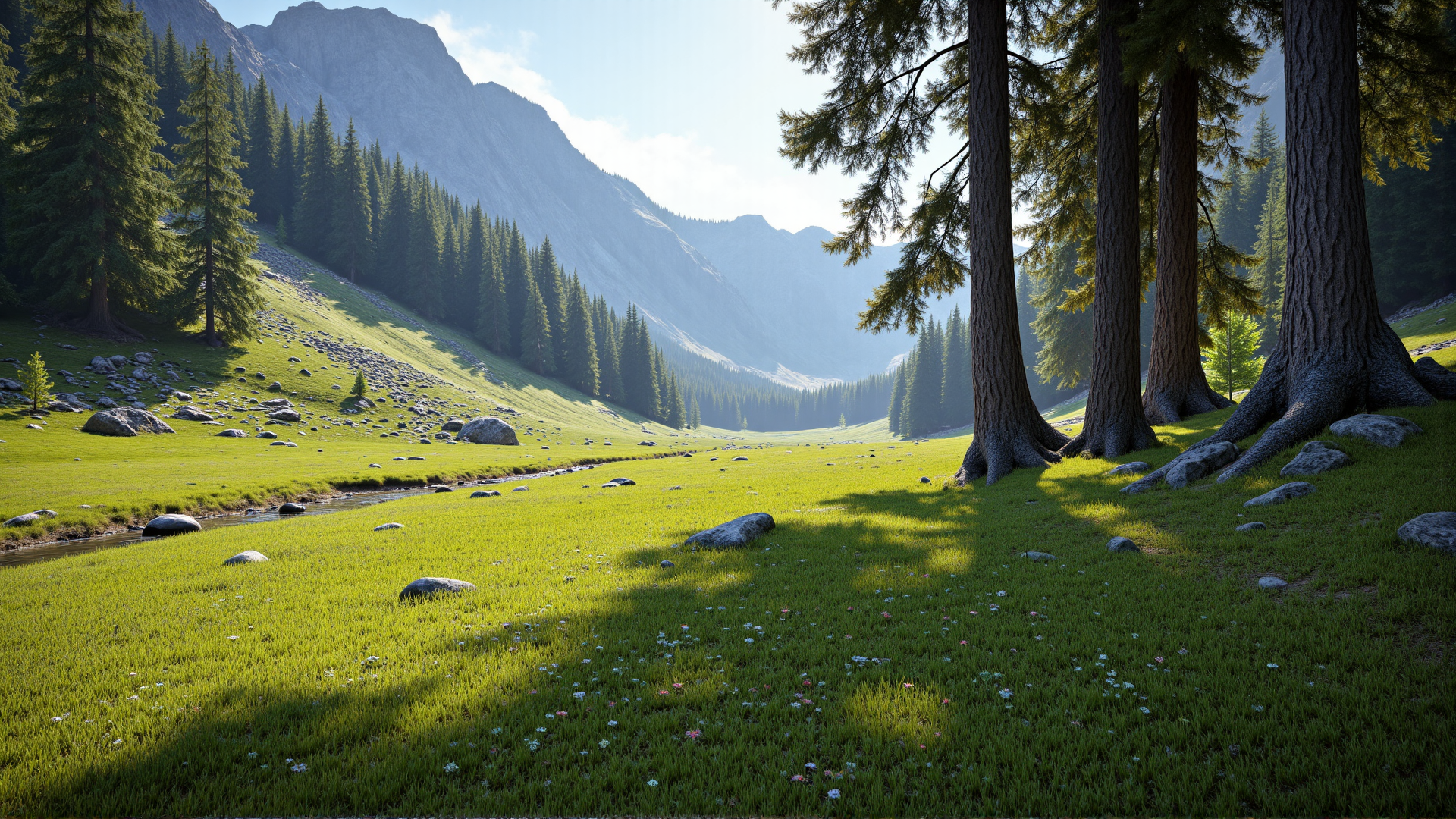 aidmaHyperrealism, a view from the top of the mountain a serene landscape with a clearing in the middle of a mountain range. The clearing is expansive, with lush, green grass and wildflowers scattered across the ground, providing a peaceful contrast to the towering, rugged mountains in the background. On the left side of the clearing, the terrain is open, with gentle slopes leading up to the mountains, while the right side is bordered by a dense forest of tall, ancient trees, their trunks thick and covered in moss. The light filters through the canopy, casting dappled shadows on the forest floor. A few scattered rocks and small streams run through the clearing, adding natural beauty to the scene.