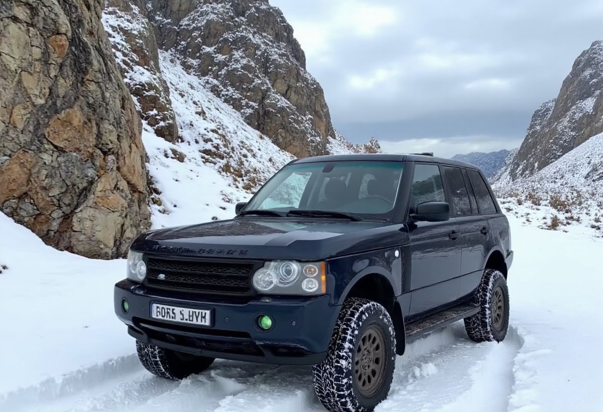 Damaged after long and road (carcrash) Range Rover L322 climbing to snow Everest, 75 degrees hill. Blizzard, snow storm, car lights on. Extreme high altitude — 8000 meters, dangerous conditions, dangerous road, storm (aidmaimageupgrader)