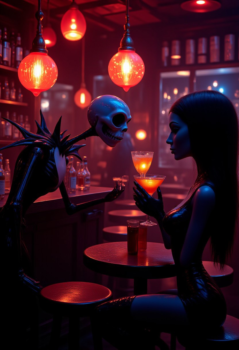 Realistic photography with a Claymation Jack Skellington drinking a glowing cocktail, sitting across a bar table from a photorealistic Elvira. aidmaimageupgrader, aidmaMJ6.1, DreamArt