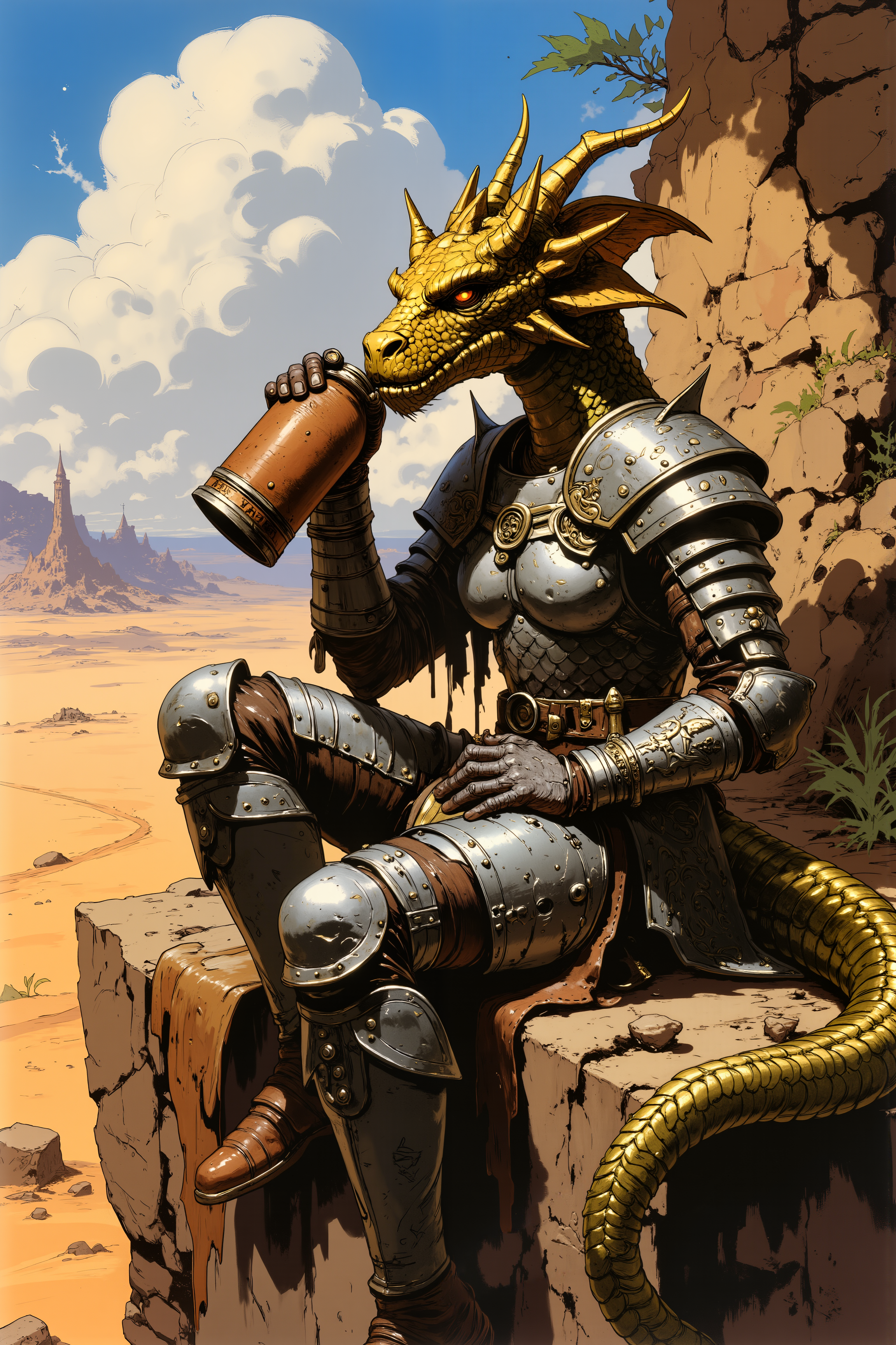 A dragonborn paladin drinks from a leather waterskin, her ancestral glaive gleaming in the sunlight. Her armor is made of overlapping scales of blessed silver, with wings etched into the breastplate and prayer scripts running down the arms. A shield bearing her clan's crest rests against her leg, still showing dents from recent combat. She sits at the edge of a cliff overlooking a vast desert, where a sandstorm brews on the horizon. Her bronze scales have a golden sheen, horns curved elegantly backward and decorated with platinum rings, while her eyes glow with an inner amber light. Fantastic lighting. Detailed shadows.intricate details, vivid colors, hyper-detailed, ultra-sharp<lora:Ev_Ganin:0.4><lora:Vintage comic book:0.4><lora:RetroAnimeFluxV1:0.15><lora:Greg_Capullo_style:0.4><lora:jeanClaude_Mzires_Style_FLUX-000001:0.4><lora:Flux_Ink_Anime:0.4>