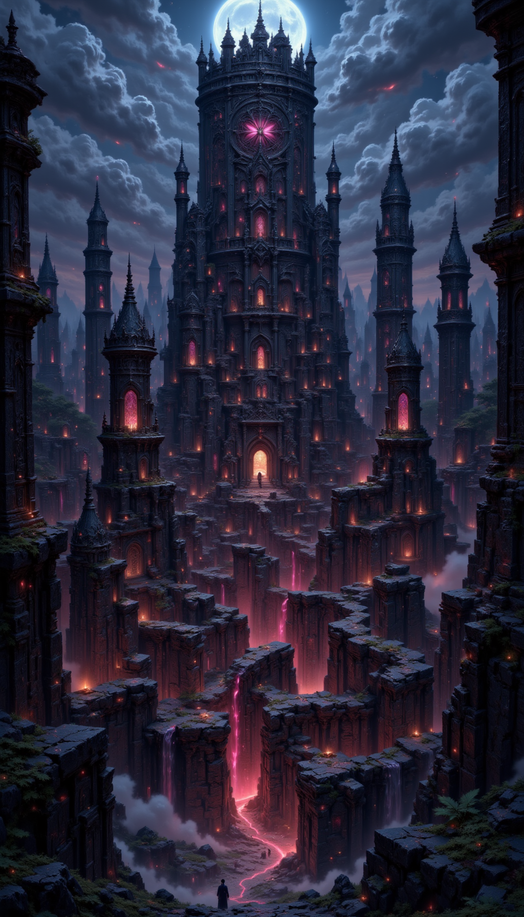 pinkmidnightfantasy, A maze of jagged black stone walls surrounding a massive, crumbling tower. Flickering torches light the labyrinth, and shadowy figures move silently through its corridors.