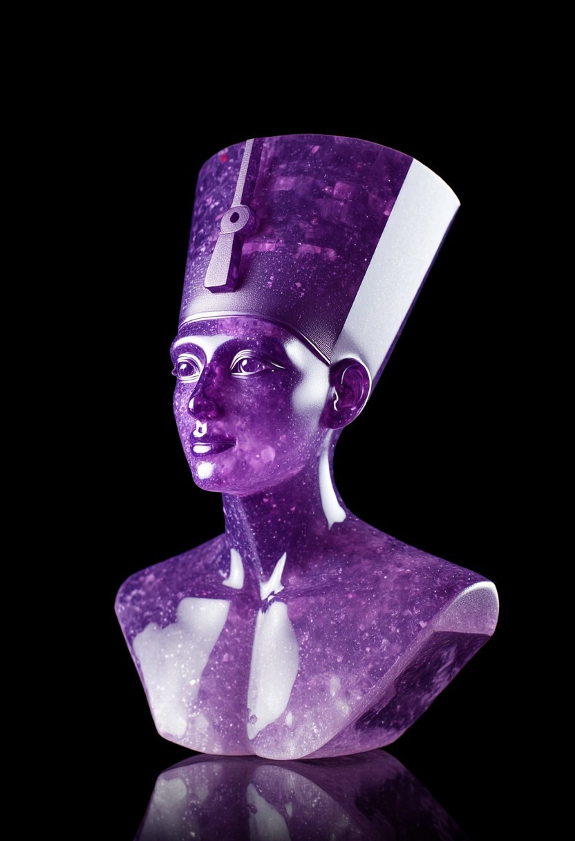 epic photography of A small-scale replica of the bust of Nefertiti, intricately crafted from sparkling amethyst crystals, displayed as a museum specimen. The statue highlights the iconic headdress, regal facial features, and timeless elegance of the original, with the translucent purple hues of the amethyst catching and refracting light. Set against a deep black background, the focused lighting emphasizes the gemstone's crystalline structure and detailed craftsmanship. The composition is minimalist and professional, evoking the aesthetic of a high-quality museum catalog photograph.