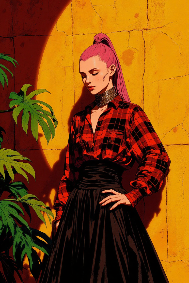 A digitally drawn hyper-realistic artwork portraying a young woman with a magnetic presence, featuring sleek, vibrant pink hair styled into a high ponytail. Her fair skin complements a strong angular jawline, and her bold red lips add intensity to her expression. She wears a semi-transparent red and black plaid button-up shirt, unbuttoned to reveal a subtle hint of cleavage, paired with a voluminous, dark textured skirt flowing gracefully to her ankles. The ensemble exudes modern elegance, enriched with intricate textures and a hint of allure. She stands poised against a vibrant yellow textured backdrop illuminated by a large circular light source, casting deep, dramatic shadows that infuse the scene with warmth and dynamism. Her left hand rests delicately on a glossy green monstera plant, its oversized leaves blending into the play of light and shadow, grounding the composition with natural vibrancy. This captivating piece merges realism with surrealism, weaving bold colors, striking contrasts, and avant-garde fashion into a dreamlike yet modern visual masterpiece.