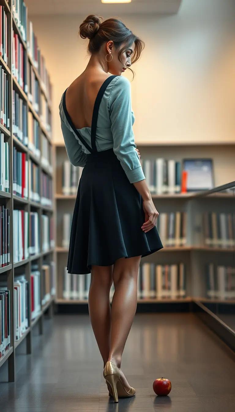 A beautiful librarian very suave and wearing a skirt picking an apple from the floor, from the back