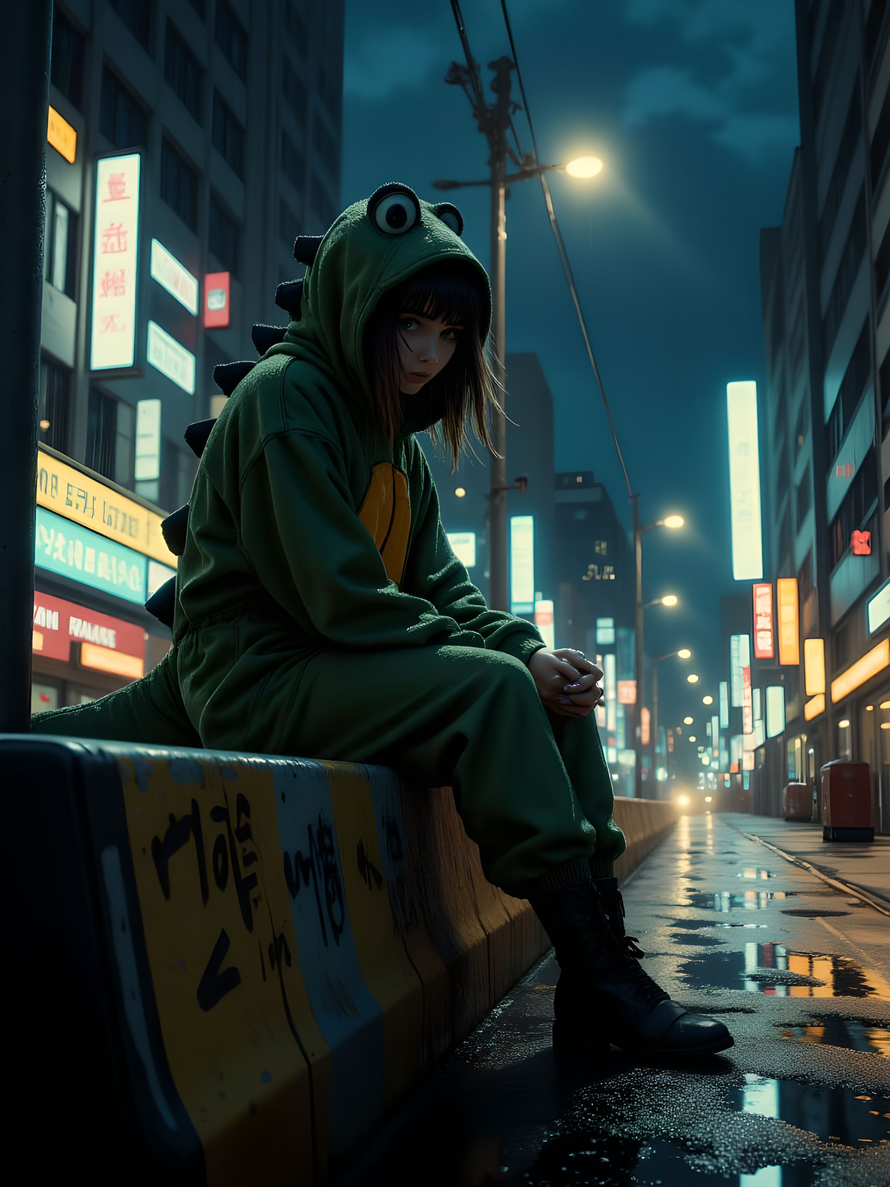 A cinematic cowboy shot of Higashiyama Kobeni, sitting dejectedly on a traffic barrier under a gloomy night sky. Her expression is one of profound melancholy, with subtle yet noticeable bags under her tsurime eyes, emphasizing her fatigued and depressed demeanor. She wears an oversized dinosaur costume with exaggerated googly eyes, adding an odd, bittersweet charm to the scene. One hand rests between her legs, while the other holds a cigarette, the faint glow of the ember casting a warm contrast against the cold rain-soaked environment. Rain falls gently, creating water droplets that cling to her costume and skin, adding to the atmospheric realism of the shot. The background is a richly detailed urban street scene, with puddles reflecting dim streetlights and neon glows from distant signs. Graffiti adorns the nearby walls, while a lamppost and scattered road signs and traffic cones add to the gritty, lived-in aesthetic. The lighting is subdued and moody, with rain casting faint, shimmering reflections across the wet pavement. aidmaimageupgrader, aidmaMJ6.1m, detailmaximizer, mythp0rt, ne0nfant4sy, drkfnts <lora:aidmaImageUpgrader-FLUX-V0.2:0.8> <lora:aidmaMJ6.1_aidmaMJ6.1-FLUX-v0.4:0.7> <lora:v1v1dr34m:0.7> <lora:aesthetic2-cdo-0.5:0.68> <lora:mythp0rt_FluxMythP0rtr4itStyle:0.68> <lora:ne0nfant4sy_NeonFantasyPrimeFLUX-000049:0.68>