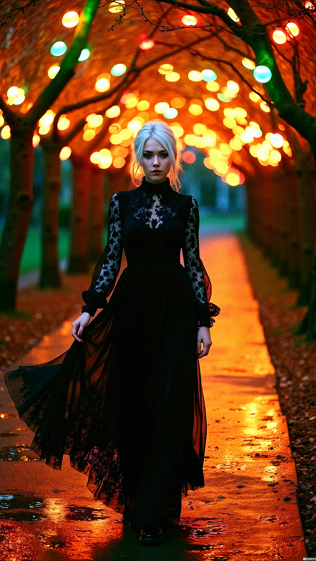 A pale, ethereal woman with ice-white hair and piercing dark eyes walks gracefully along a glowing, tree-lined pathway. Her black lace dress, featuring sheer sleeves and a ruffled high neck, moves softly as if the forest itself breathes around her. The path beneath her feet shimmers with reflected light, a mosaic of warm and cool tones radiating from the glowing orbs that hang delicately from the branches above. The trees, barren yet alive with vibrant colors of amber, green, and deep red, create a dreamlike tunnel leading toward an unseen destination. Her gothic beauty and enigmatic presence add to the enchantment of the scene, making her feel like a guardian of this mystical realm. Extreme emphasize on photorealistic, realistic detail, realistic reflection detail and realistic background detail.