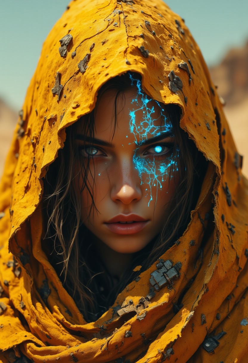 A captivating cinematic close-up of a mysterious, hooded figure set against a warm and muted desert landscape. The figure's sand-colored cloak is adorned with rugged fabric textures and hints of metallic elements peeking from beneath the hood. Their intense, otherworldly expression is framed by a dusty veil, amplifying the gritty, dystopian atmosphere. The figure's eyes glow with an eerie blue light, surrounded by intricate neon blue circuitry patterns that blend ancient and futuristic aesthetics. The background exudes a vibrant, desert-like ambiance, with the air of a forgotten, post-apocalyptic world