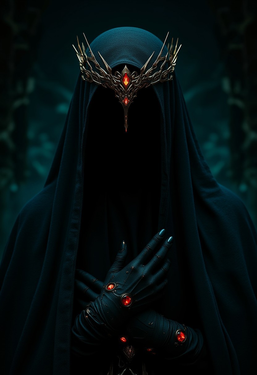 aidmaMJ6.1, In this haunting dark fantasy portrait, a veiled queen stands in silent command, her power palpable and unsettling. Shadows drape her partially hidden face, adding an enigmatic layer to her regal poise. A crown adorned with vivid crimson accents pierces the deep teal and black palette, underscoring her fierce sovereignty. Low-key lighting sculpts dramatic contrasts, revealing the intricate textures of her attire. The ominous background deepens the sense of secrecy and allure, while a cinematic approach—cyberpunk, shallow depth of field, high ISO grain, and the intimacy of an 85mm lens—captures her presence in a vivid yet dreamlike tableau.