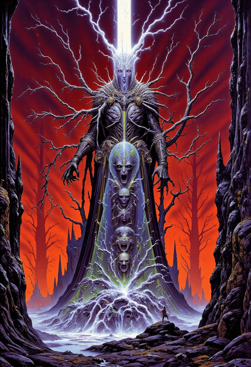 A haunting cyberpunk surrealist scene: a featureless humanoid figure, its face a smooth, blank void, stands amidst a fractured, metallic wasteland. Wires and glowing cables erupt from its body, writhing like serpents, connecting to massive, biomechanical towers in the distance. The sky is a chaotic swirl of neon red and fiery violets, crackling with digital distortions and fractured light. The figure's body is partially transparent, revealing an intricate, cybernetic interior filled with pulsing lights and screaming faces trapped behind glass-like panels. A glowing neon aura surrounds the figure, flickering as if it’s glitching in and out of existence. The air is thick with tension, filled with the hum of malfunctioning grotesque machinery and distant echoes of tormented cries. The composition is claustrophobic yet vast, merging the cold detachment of cyberpunk and science fiction with the existential dread of surrealism, evoking a desperate, silent scream in a digital dystopia. best quality, masterpiece,detailed,asymmetrical compsition,Directional Lighting, ,intricate, highly detailed, high contrast