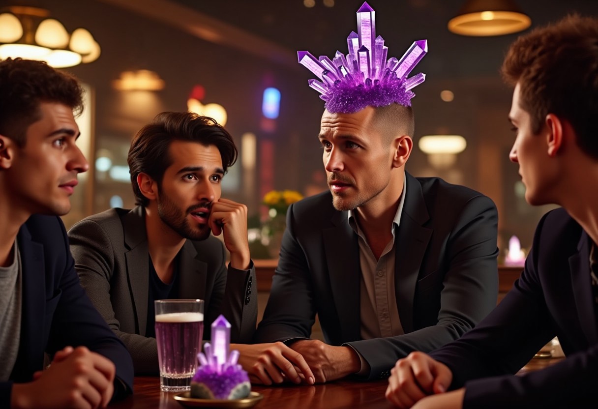 A man in a bar has sparkling amethyst crystals growing out of his forehead. The man doesn't seem to notice anything is odd. But his friends are looking at him with confused and worried expressions. Angled view so that everyone's face is visible