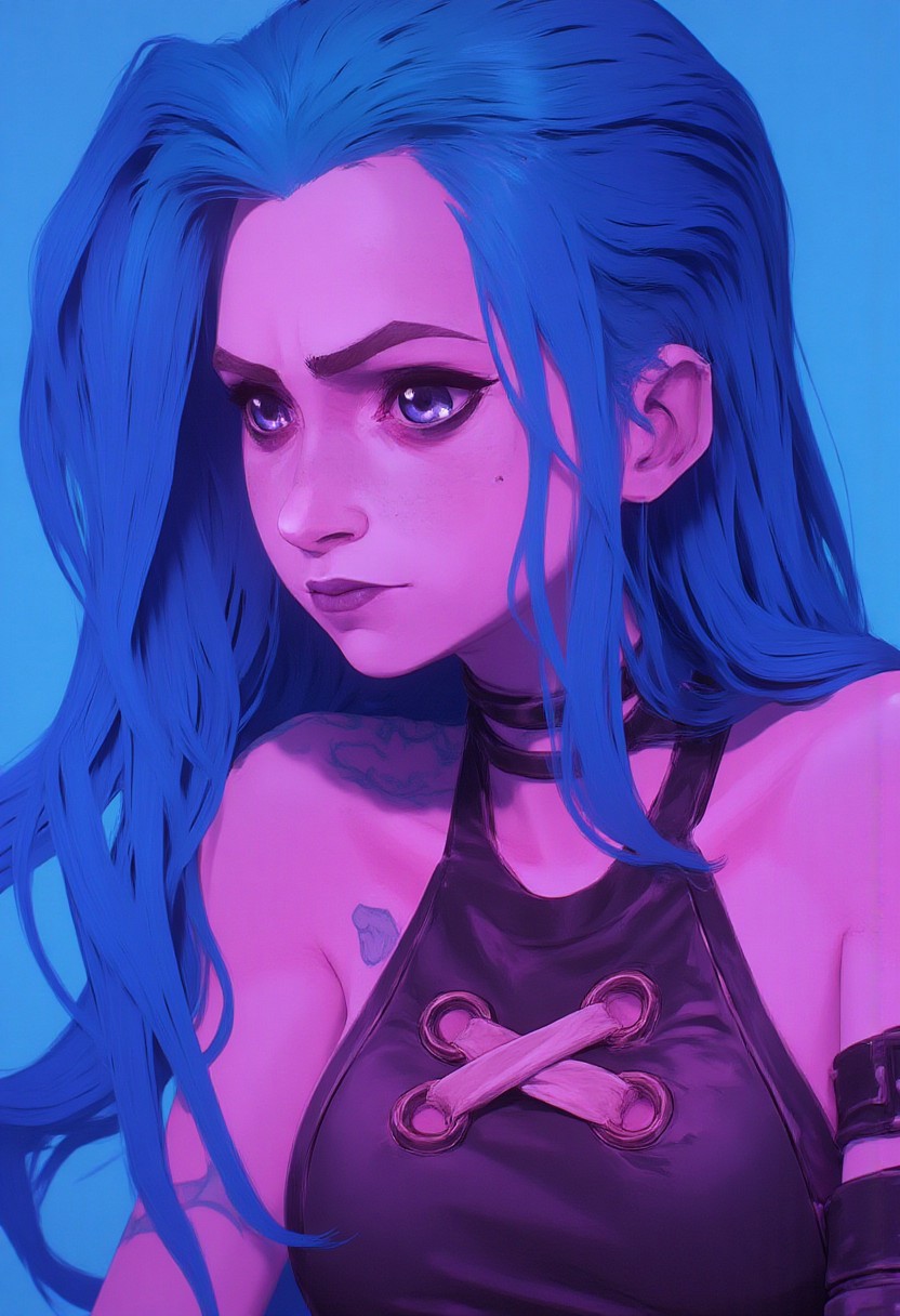 Score_9, Score_8_up, score_7_up, high contrast neon anime style in blue and pink, Jinx, upper body, 3/4 view