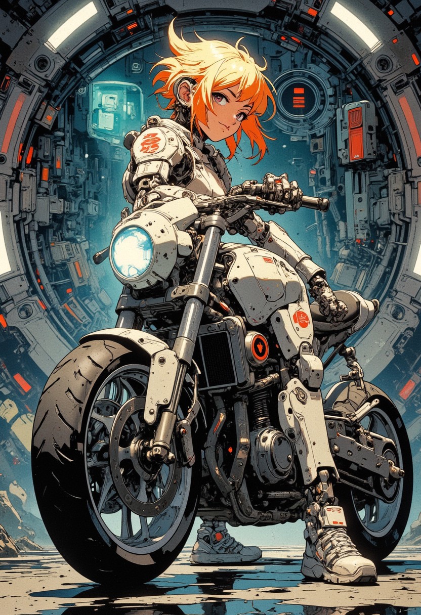 1 cute cyborg lady holding onto futuristic motorcycle with left Hand , left hand on bike throttle riding on stopped super futuristic motorcycle , multicolored hair Orange & Blond , cute lady, proper pretty eyes, shy blush and cheeky grin , short Pixie hair , cyborg appendages in matching pairs , proper robot Sneakers , proper robot hands , Sci-fi, ultra high res, futuristic , {(little robot) }, {(solo) }, full body , {(complex, Machine background ,spaceship interior background, Mecha Transport parts) }, LaraWaifu face