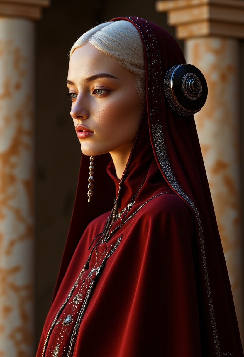 Masterpiece, oil painting, close-up portrait of a regal princess with an elegant and minimalist attire that highlights her slender figure. She wears a tailored gown of deep crimson velvet, designed with clean, form-fitting lines that subtly accentuate her waist and shoulders, flowing into a graceful cape of the same crimson hue. The gown features a modest silver trim and refined details that enhance its sophistication without overwhelming the simplicity. Her obsidian crown with delicate silver inlays sits elegantly on her head, perfectly complementing her serene yet confident expression. Her smooth pale skin and radiant platinum hair frame her face, with intricate and hyper-realistic details that capture the sharpness of her features, from her piercing light blue eyes to the delicate texture of her lips. The background is a subdued royal hall with marble columns and soft, warm light, emphasizing her presence. Dramatic and soft cinematic lighting highlights the contours of her figure and the textures of her attire, balancing realism with timeless regality.