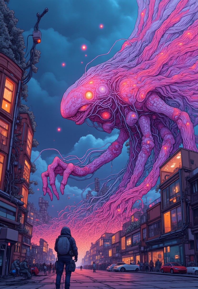 A chaotic battlefield of hi-tech digital constructs, featuring [tank | exoskeleton | mecha] made of tiny neon filaments and cables. These intricate entities are fighting each other in a dynamic wireframe vector graphic environment. The scene includes electrical interfaces, power cords, and glowing inputs. The overall style is realistic and futuristic, rendered with hyperdetailed textures, vibrant colors, and a painterly aesthetic. The composition emphasizes dreamlike, surreal elements with advanced technology, such as holographic overlays, liquid crystal reflections, and multiple layers of intricate design. The setting merges scientific displays with conceptual digital artistry, resulting in a masterpiece-level image with expressive and dynamic energy.