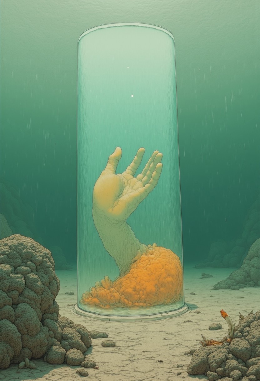 An enigmatic composition bathed in soft, diffused light, blending whispers of surrealism and melancholia. The scene unfolds in a cinematic atmosphere where subtle textures and delicate grains add depth, while the interplay of light and shadow enhances the quiet intensity of the moment. A subdued color palette merges with ethereal haze, evoking a dreamlike quality and timeless stillness. The central subject –A wide crystal-shaped glass pillar lies submerged at the bottom of a tranquil body of water, its infinite transparent surface refracting vivid rays of green light that filter through the liquid above. Inside, at its base, a giant orange luminous creature glows and plays on the surrounding sand. It exudes a mysterious and otherworldly aura, as if it has rested undisturbed for ages, a silent witness to the flow of time beneath the water's surface.– is delicately framed, their presence balanced between mystery and intimacy. Surrounding elements, rich in symbolic undertones, anchor the narrative in an otherworldly context. Organic details like softly swaying flora or faintly glowing surfaces contrast with stark, haunting figures, creating a juxtaposition that is both poignant and surreal. The composition invites introspection, with negative space amplifying the mood's resonance. Every detail, from the atmospheric depth to the muted highlights, serves to craft an image that feels suspended in an emotional, poetic realm, steeped in quiet nostalgia. surreal style