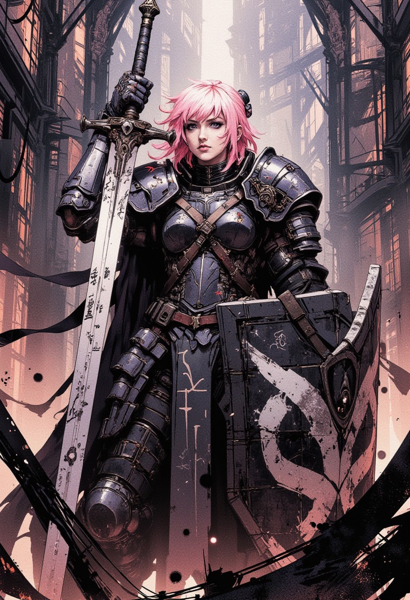 A digital painting in the style of ck-js, nistyle, a female paladin commander. Pink pink hair, Gothic makeup, eyeliner, eyeleashes, Black lips, white graffiti in black Full plate armor, standing in fortress, holding up a sacred Avenger light bastard sword, kite shield with a skill Graffiti