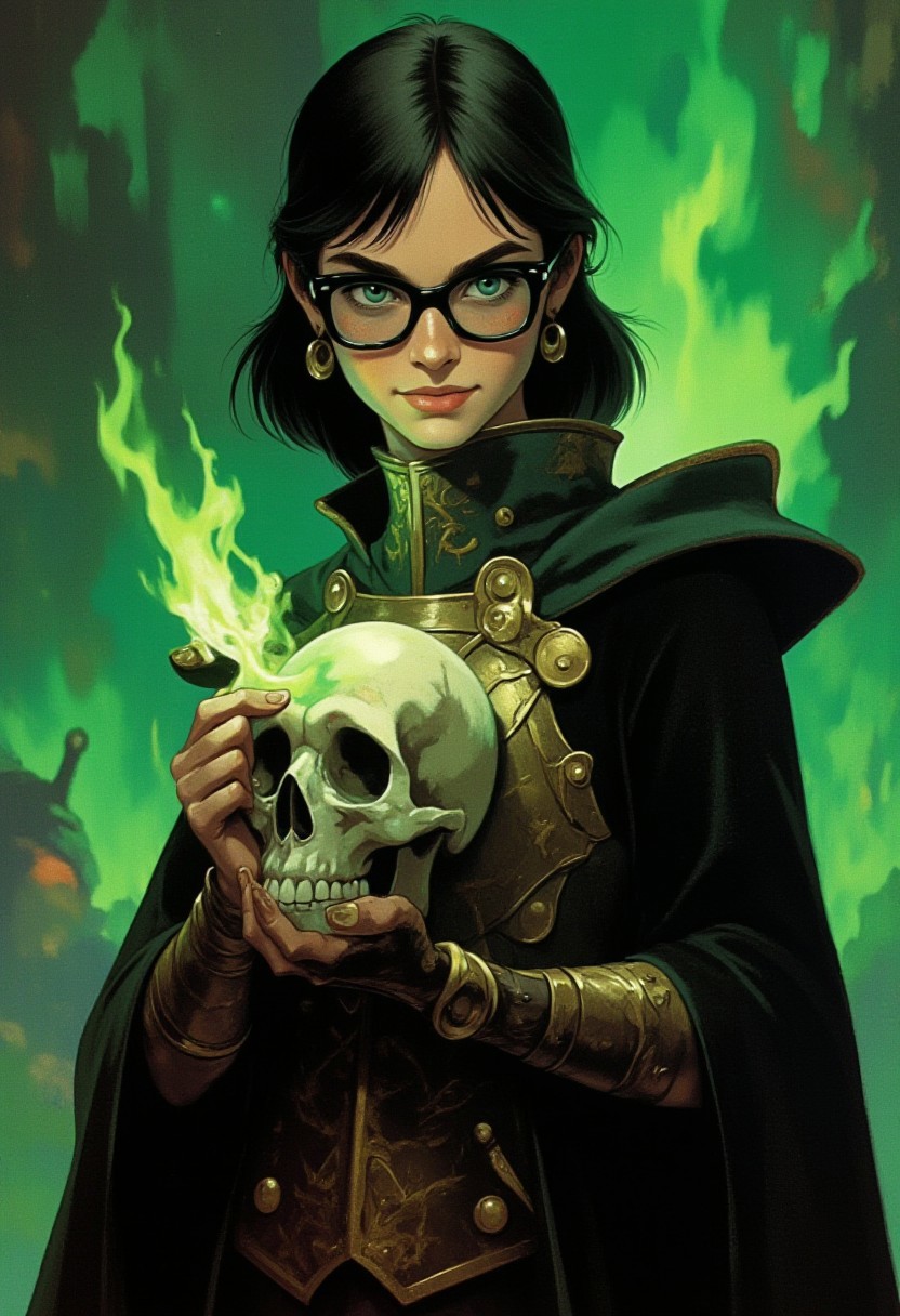 Disney Style, Frank Frazetta fantasy oil painting kidbook illustration of young girl as a warlock necromancer, holding a skull that is glowing green with magic, wearing leather armor breastplate and long black cloak, large black rimmed glasses