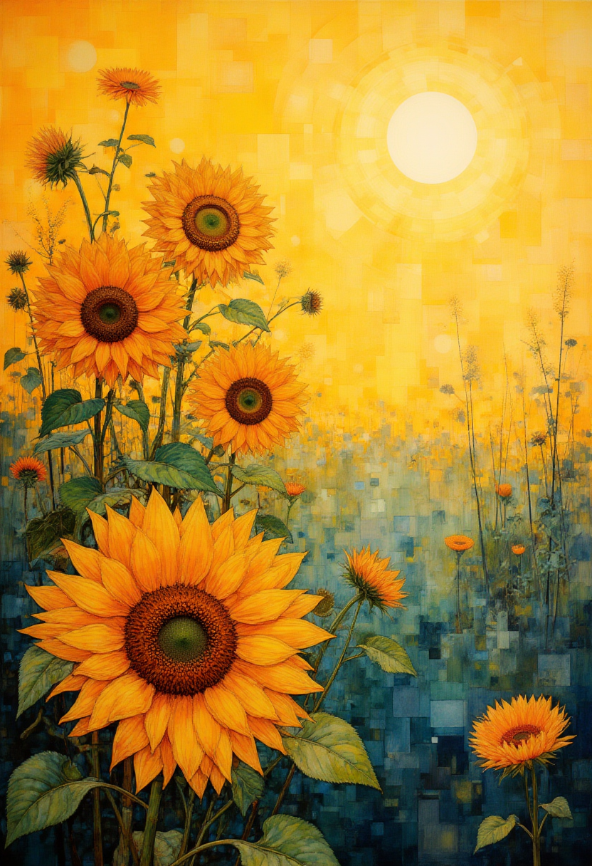 A lively canvas showcases an enchanting tableau of sun-kissed sunflowers flourishing with exuberance amidst a gently swaying sea of verdant grass. Their magnificent golden petals, meticulously crafted with delicate fringes, gleam brightly as they reach towards the warm, radiant sunlight, casting inviting shadows that dance across their surfaces. This visually arresting panorama seamlessly merges vibrant hues with an ethereal play of light and dark, effectively highlighting intricate textures and forms. The sunflowers serve as an irresistible focal point within the picture, captivating viewers' attention while guiding their gaze into the tranquil expanse of lush greenery, which extends into the picturesque horizon. This artpiece not only embodies the ephemeral magic of a sunny summer day but also evokes an intangible connection between life's simple pleasures and nature's boundless beauty. ,<lora:flux/Digital painting V1.safetensors:1.0:1.0>