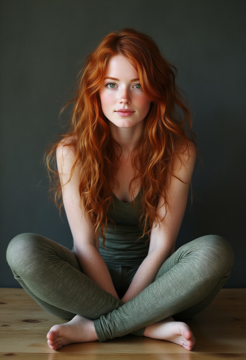 FictionalSabrina A red head girl with green eyes, Sitting on a beanbag, bare feet,feet to viewer