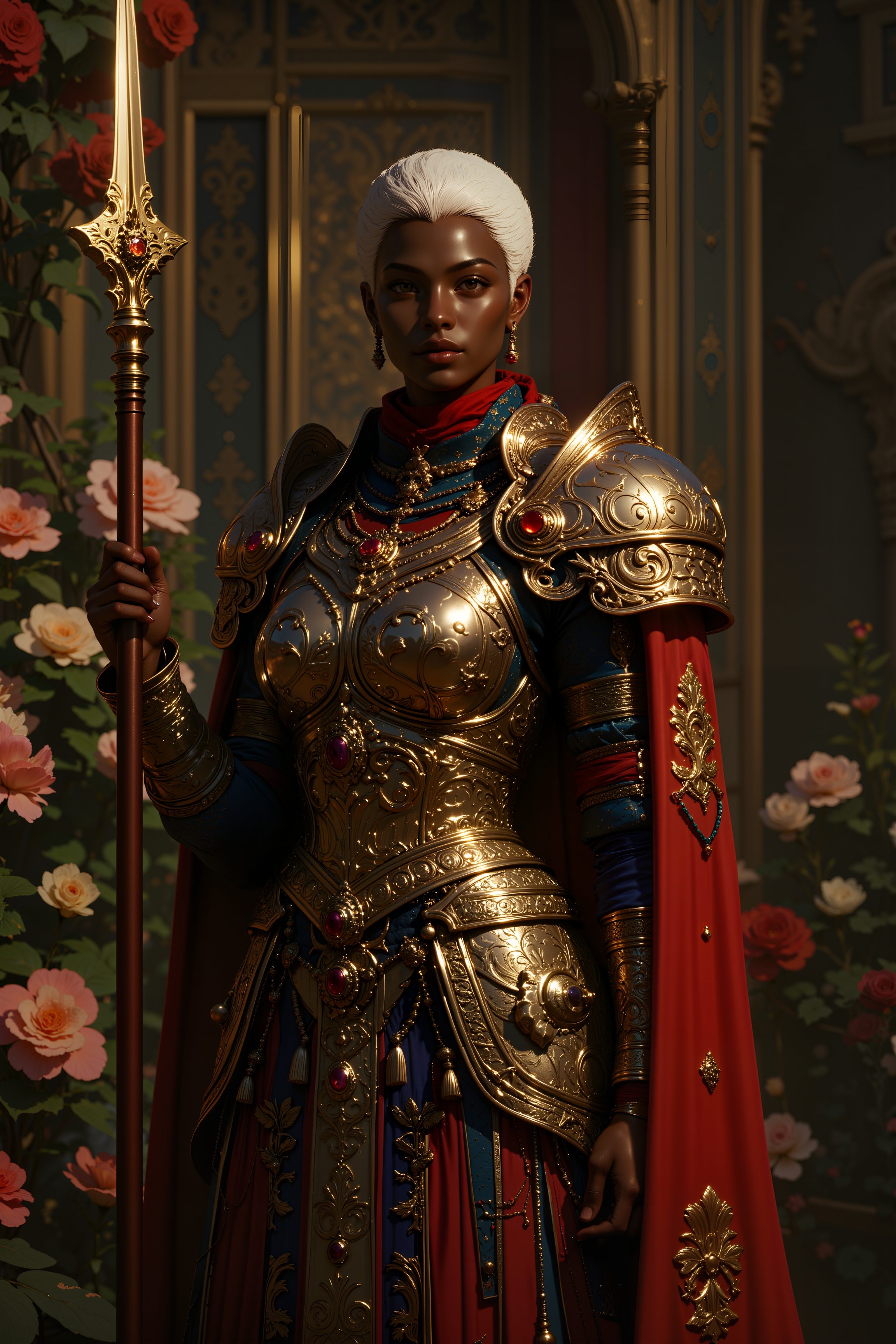 concept art cinematic film still, A royal guardswoman stands at ease, ceremonial spear held loosely as she rests. Her parade armor gleams with gold filigree over steel plate, each piece inscribed with prayers for the royal family's protection. A sword of office hangs at her hip, its jeweled pommel marking her rank, alongside several hidden weapons. The palace gardens spread out behind her post, where nobles stroll among carefully tended exotic flowers. Her ebony skin contrasts with precisely maintained white hair, part of her guard unit's tradition, while her dark eyes constantly scan for threats. , detailed background <lora:FluxMythM4gicalL1nes:0.79> m4gicall1nes <lora:Movie_Portrait:0.5> <lora:flux.1_lora_flyway_Epic-detail_v2:0.6> . . shallow depth of field, vignette, highly detailed, high budget, bokeh, cinemascope, moody, epic, gorgeous, film grain, grainy . digital artwork, illustrative, painterly, matte painting, highly detailed