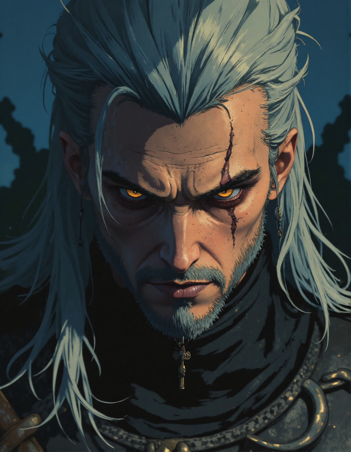 Intense gaze of a Witcher: Extreme close-up on the face of Geralt of Rivia, focusing on his piercing yellow eyes, a deep furrow between his brows, silver hair framing his face, subtle scars visible, dark and gritty atmosphere, high contrast lighting emphasizing his determined expression, hint of chainmail visible at the edges of the frame, dark and moody background, hyperrealistic rendering, cinematic lighting, ppg3r4lt, <lora:ì묵í:0.8>, <lora:NeonFantasyPrimeFLUX:0.7>, <lora:Geralt_of_Rivia_-_The_Witcher_3:0.4>