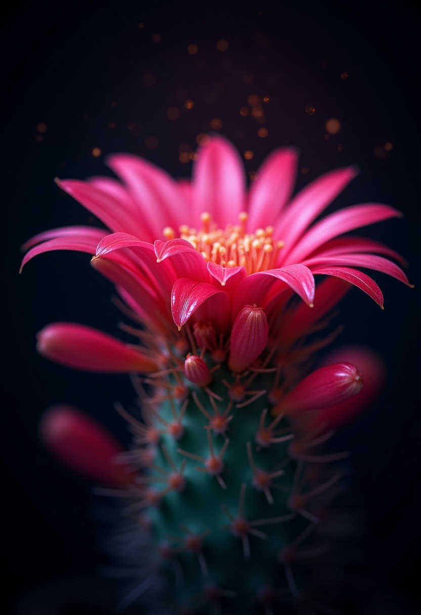 vibrant ,pink ,white ,green Bleeding Christmas cactus flowers and colorful against a pitch-black background Painterly, surreal, vibrant glow, bokeh, 8k,