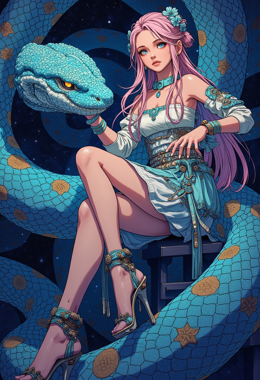masterpiece, best quality, good quality, very aesthetic, absurdres, newest,1girl, delicate hanfu, animal, blue eyes, crossed legs, giant snake, girdle, high heels, jewelry, long hair, oversized animal, pink hair, snake, looking_at_viewer, Epic,Great,Motherly,sacred, Petting the snake head Chiaroscuro, Graffiti Art, Bioluminescent, Glowing, Shot Canon EOS R5 Macro Lens, Azure color, Obsidian Color, Saffron Color, Prism Effect, Aluminum, Bronze, Ceramic, Adventure, Fantasy, Science Fiction, Quasar Quilt Backdrop, Hyper-realistic, 8k, midjourneyv6.1, By Garald Brom