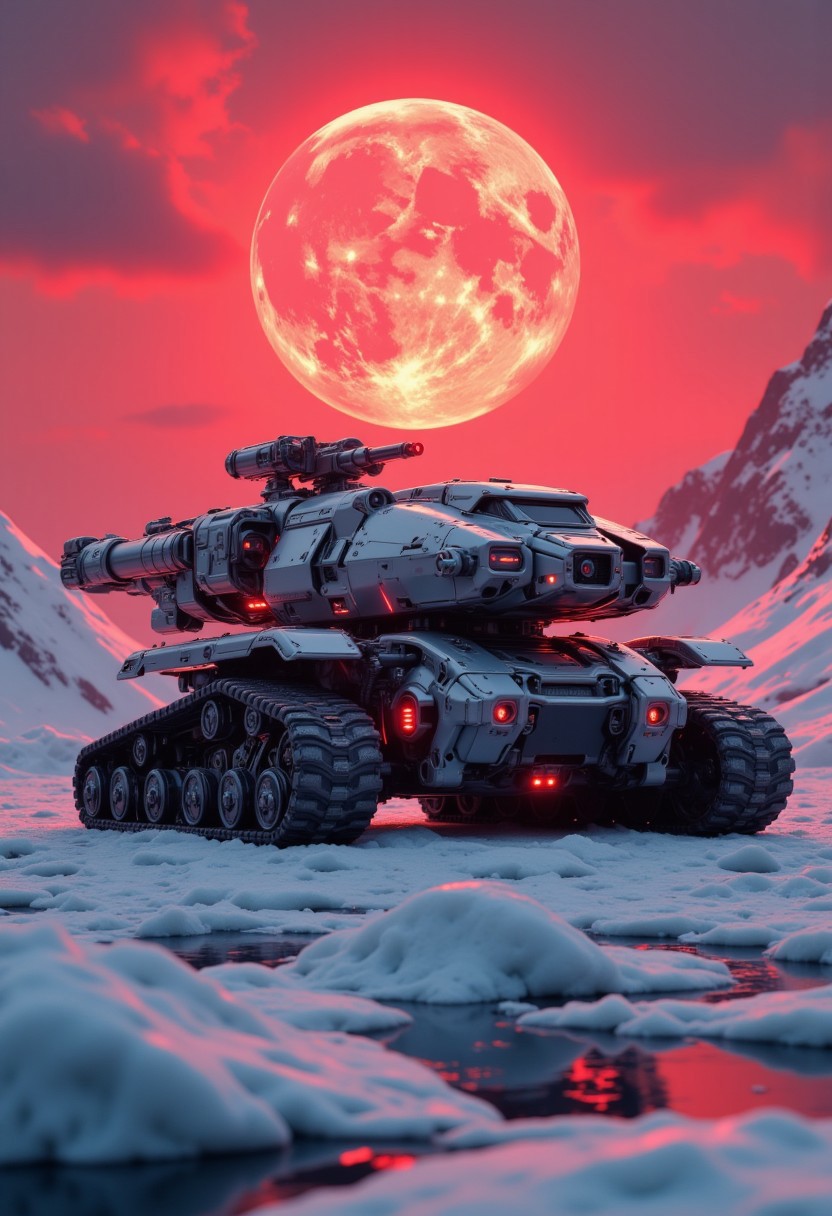 CAICO, Inkpunk Anime, red and white theme, detailed photorealistic image, a_skynet_cyberdyne_craft, the image is featuring a moonlit scene of a Cyberdyne armoured tank on a glacial landscape of ice and snow, caterpillar tracks, with white and gunmetal grey alloy surfaces with high-end circuitry, red glowing diodes and lights, giving a highly advanced, industrial military look, with large plasma cannons and rocket launchers; large depth of field. Sunset, the sky is a vivid red